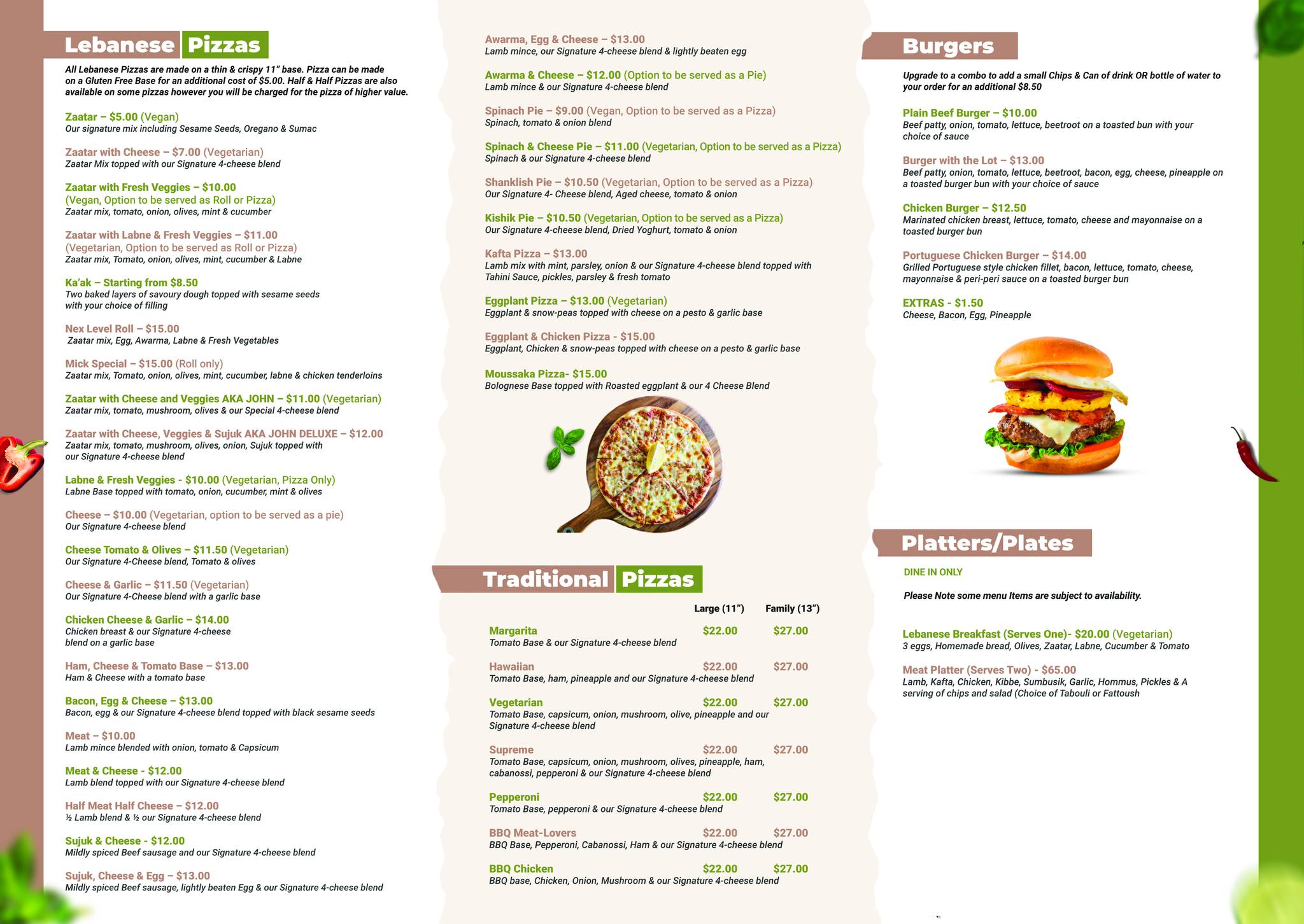 All Lebanese Pizzas are made on a thin and crispy 11" base. Pizza can be made on a Gluten Free Base for an additional cost of $5.00. Half & Half Pizzas are also available on some pizzas, however, you will be charged for the pizza of higher value.